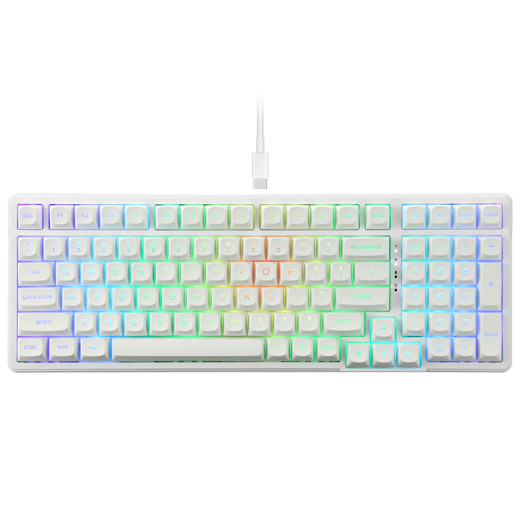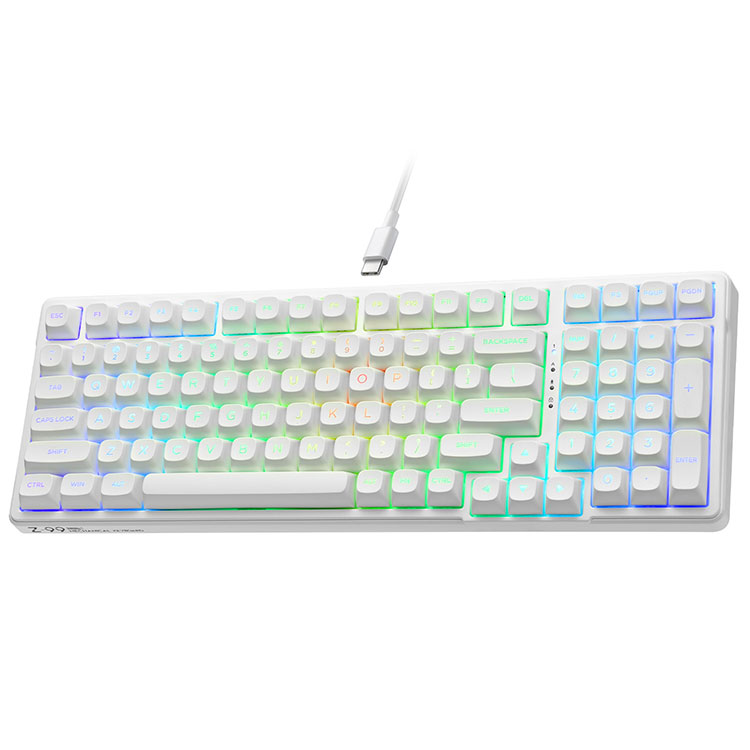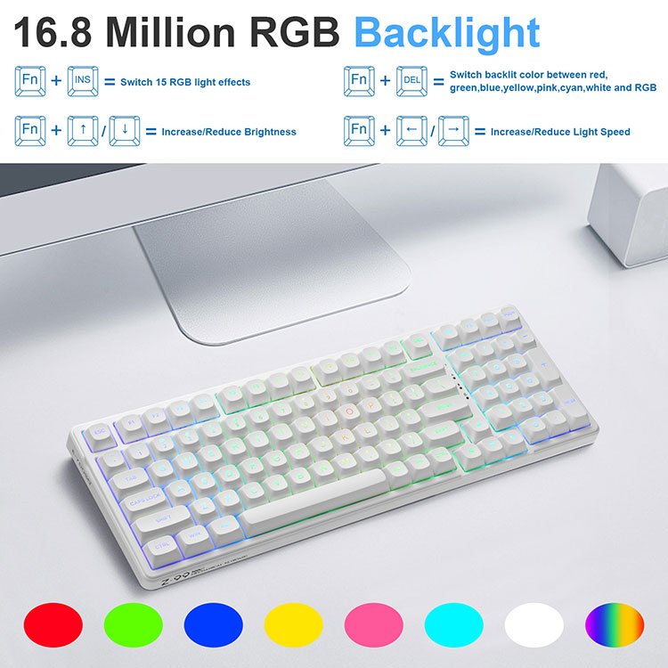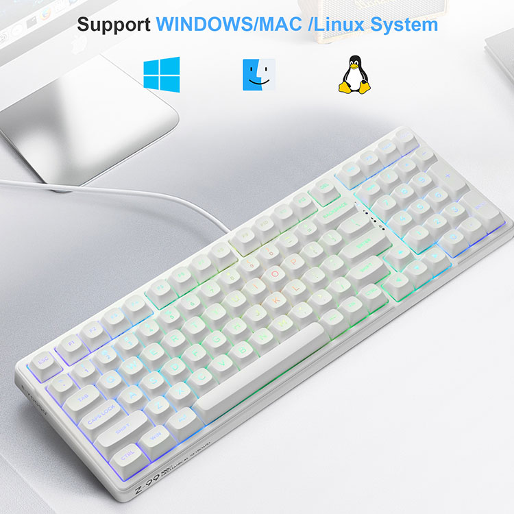 · 【Cool RGB Backlit Effekt】Z-99 RGB Keyboard enthält 15 Géigeliicht Effekter an 8 zolidd Géigeliicht Faarf Wiesselt. Verschidde RGB-Astellung beräichert Är Tippzäit. Beliichtungsgeschwindegkeet an Niveau kënnen och no Ärem Bedierfnes ugepasst ginn. Duebel Schoss Injektioun PBT Keycaps, Charakter ni Fade.