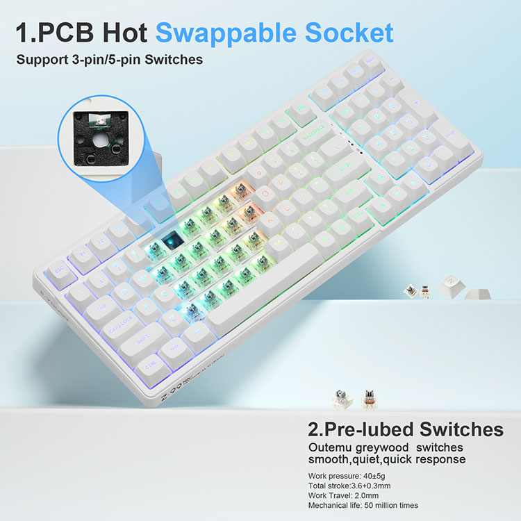 · 【Hot-swappable Custom Keyboard】D'Schalter an d'Schlësselkappe kënne fräi ersat ginn (Keycap / Schalter-Puller sinn am Package abegraff). Dës personaliséierbar Tastatur mat Hot-Swap PCB erlaabt d'Benotzer 3 Pins / 5 Pins Schalter einfach ze ersetzen ouni Lötproblem. Z-99 mechanesch Keyboards equipéiert mat pre-lubed linear Schalter, bréngen glat Tippgefill an agreabel Tippkläng, bitt séier Äntwert fir spannend Spill.