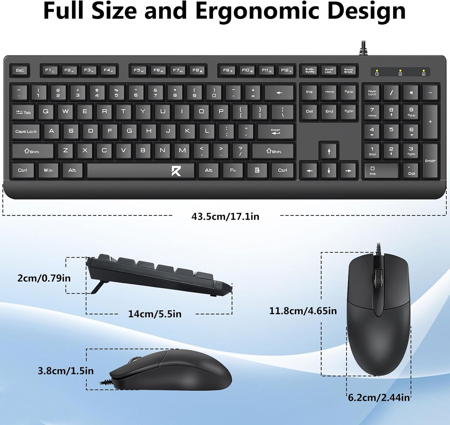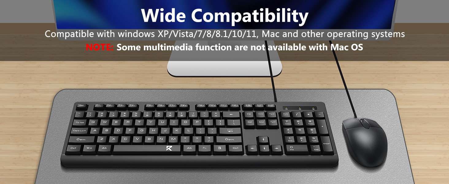 Déi voll Gréisst Tastatur Layout enthält eng numeresch Tastatur, Multimedia Schlësselen, a komfortabel Abstand tëscht Schlësselen. Déi begleedend Maus ass fir präzis Tracking a glat Cursorbewegung iwwer verschidde Flächen entwéckelt.