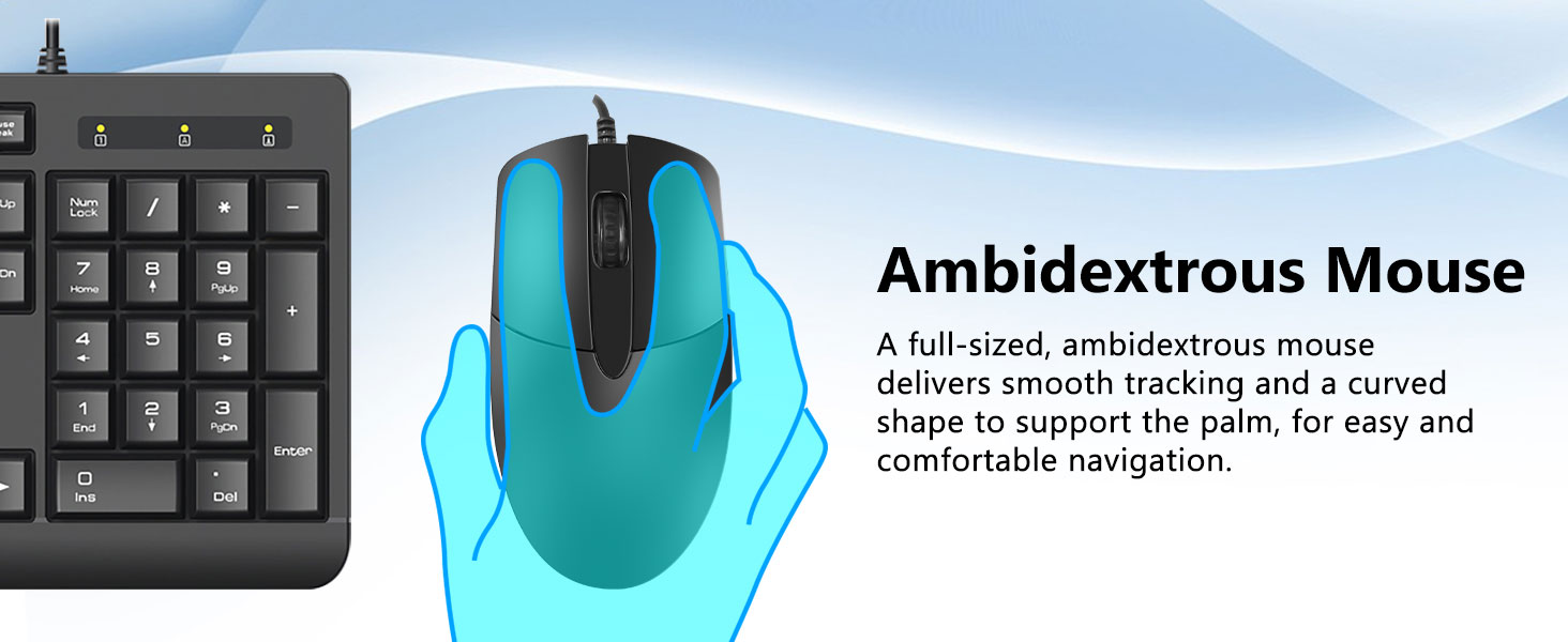 D'Black BC7543 Wired Keyboard a Mouse Combo huet e Standard Tastatur Layout mat voller Gréisst, dorënner eng speziell numeresch Tastatur. Dëse Layout ass ideal fir Büroaufgaben wéi Dateentrée, Finanzaarbecht a Spreadsheet Management.