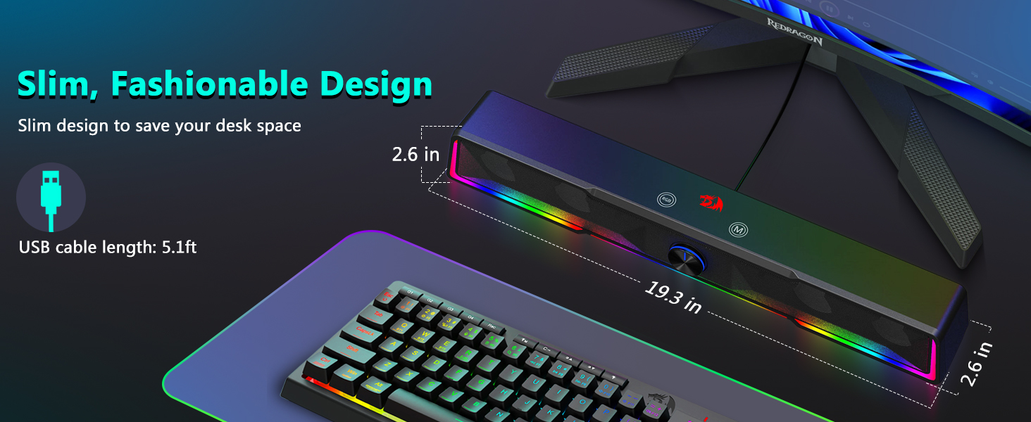Am Géigesaz zu traditionelle Spriecher déi grouss Flächen op béide Säiten vun engem Monitor besetzen, huet de Black GS516 Bluetooth / USB Wired Connection Soundbar Volume Knob Computer Speaker eng schlank Soundbar Struktur déi bequem ënner de meeschte Computerbildschierm passt.
