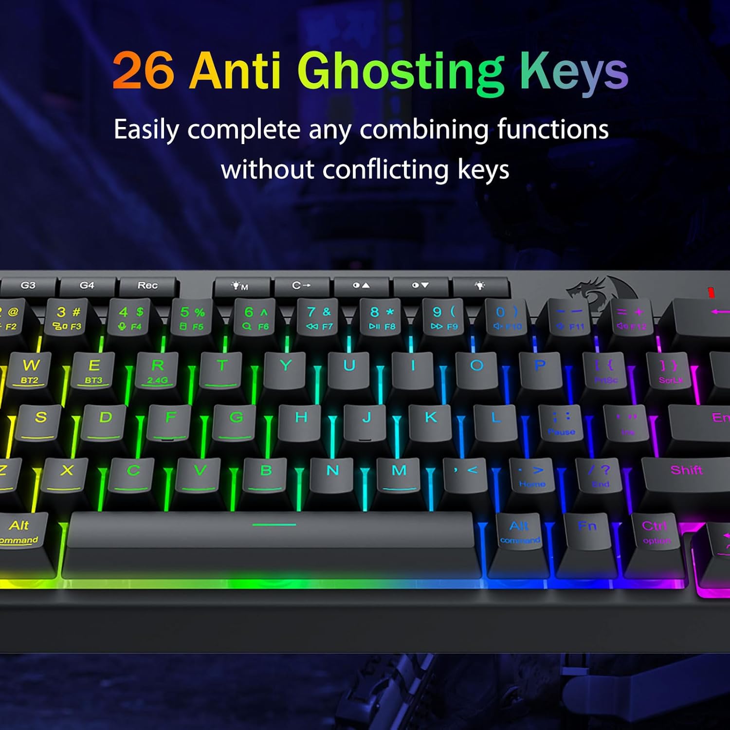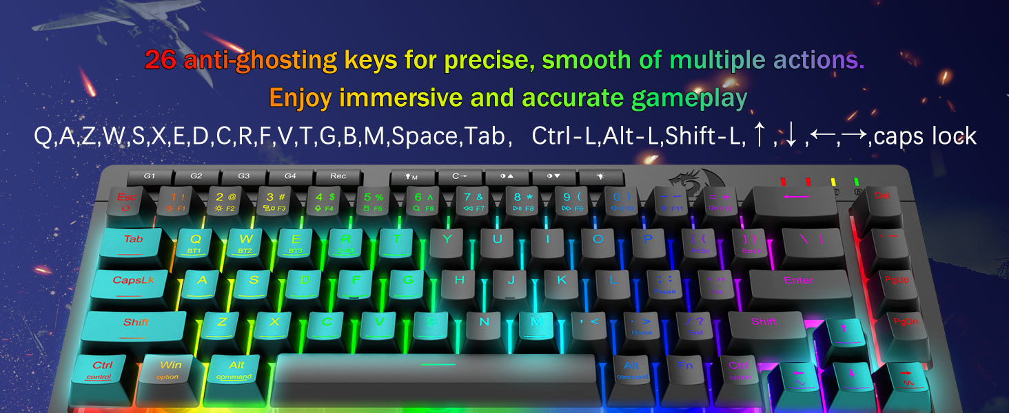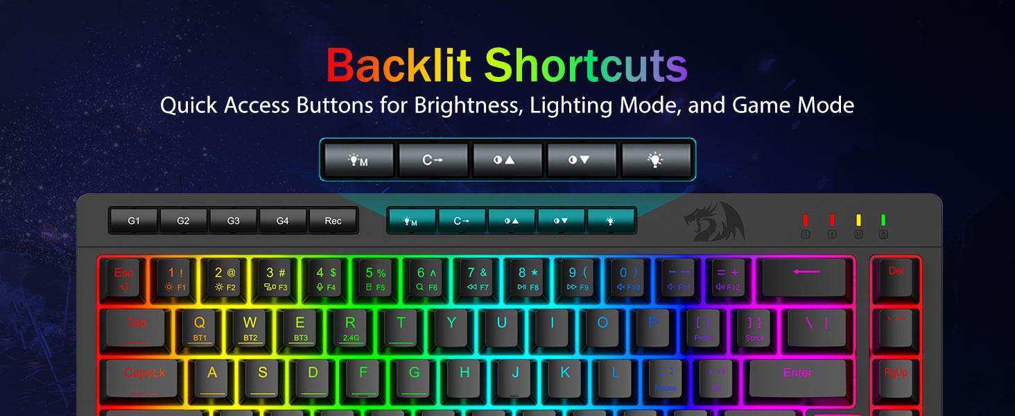Pro-Grade Gaming Performance & Engagéierten Backlit Kontrollen -Featuring Anti-Ghosting Schlësselen (Schlëssel mat engem Ënnerscore) déi et erlaben 26 Schlësselen gläichzäiteg ze schaffen fir séier a präzis Spillreaktiounen wéi Dir geduecht hutt. Quick Access Buttons fir Hellegkeet, Beliichtungsmodus a Spillmodus fir d'Hellegkeet, d'Beliichtungsprofile séier unzepassen an de Spillmodus mam Touch vun engem Butto z'aktivéieren.