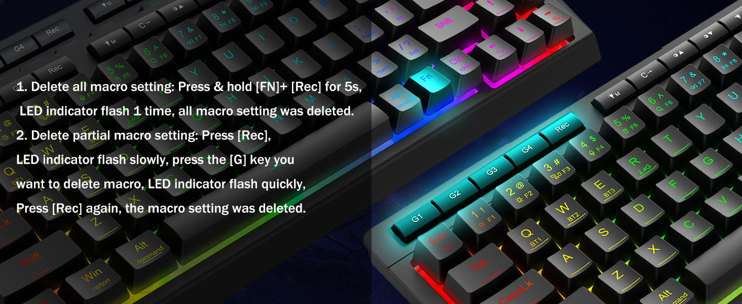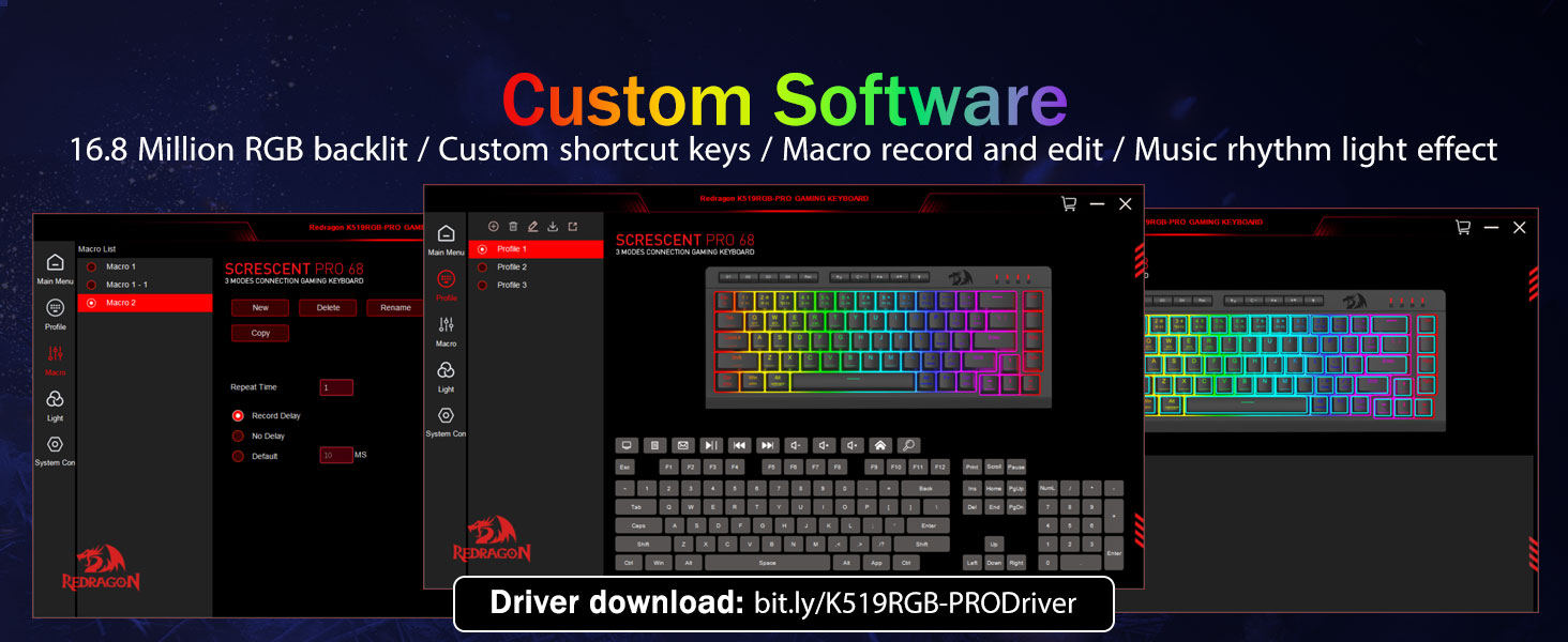 Customizable Macros, Effortlos Kontroll -Programméiert déi 4 Onboard Makro-Schlësselen (G1-G4) direkt - keng Software erfuerderlech. Rekord komplex Comboen fir Gaming, Ofkiirzungen fir Produktivitéit oder Medienbefehl. Definéiert Äre Workflow a Sekonnen nei. Dir kënnt och Software benotze fir Funktiounen ze personaliséieren, Makroen ze kreéieren, RGB Luuchten unzepassen an Ofkiirzungen ze setzen. Software Link: bit.ly/K524RGB-PRODriver