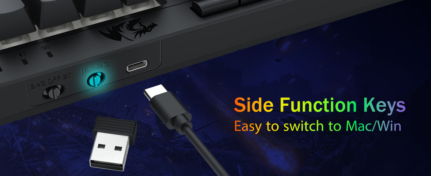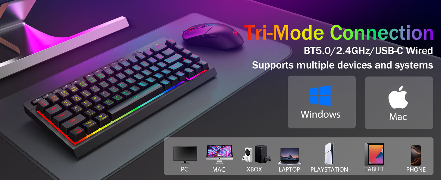 Tri-Modus Villsäitegkeet & Multi-Device Mastery -Schalt nahtlos tëscht Bluetooth 5.0, 2.4GHz Wireless oder USB-C bedrade Modi, verbënnt bis zu 5 Geräter gläichzäiteg (PC, Mac, Pëllen, Telefonen, PS/XBOX). Klappt ouni Ustrengung Geräter iwwer Ofkierzungsschlësselen oder Säit Knäppchen - perfekt fir Hybrid Aarbecht / Spillopstellungen. Bleift fir Wochen ugedriwwen mat der 4,000mAh Batterie (30+ Deeg Standby, 50hrs RGB Runtime).
