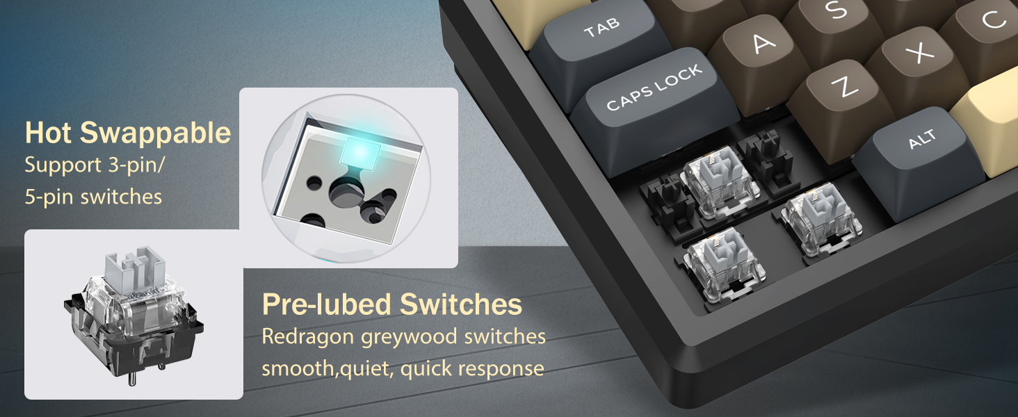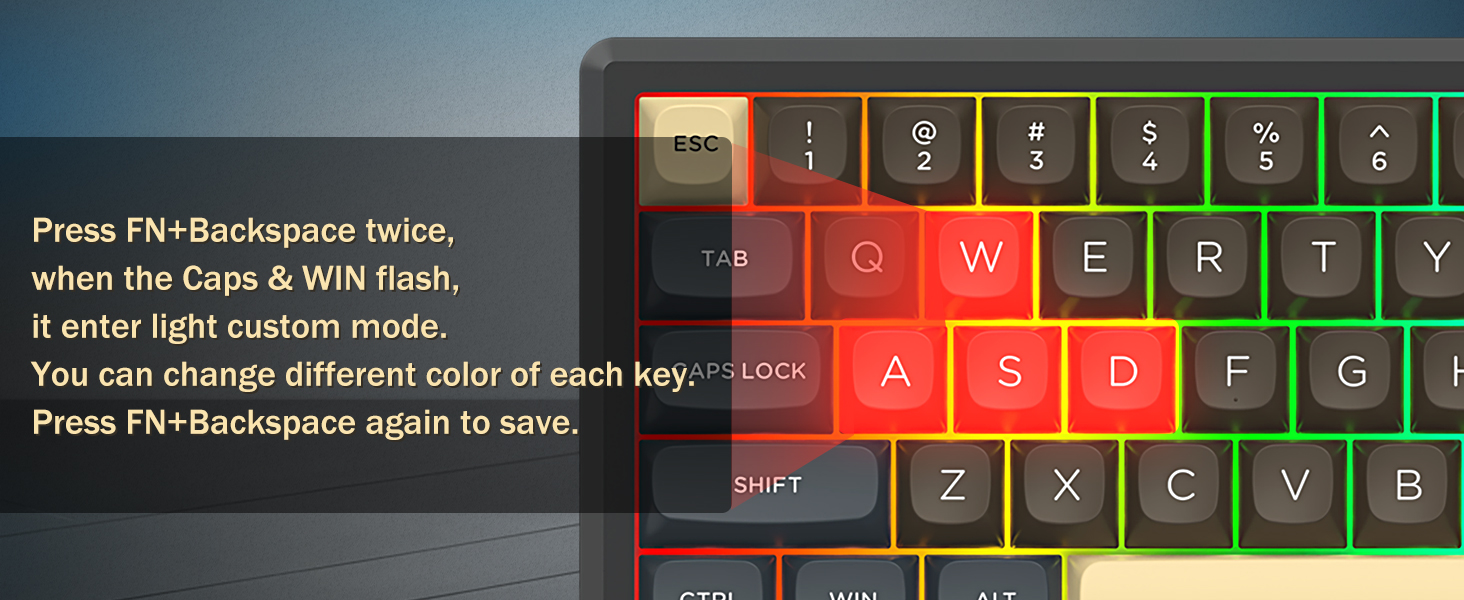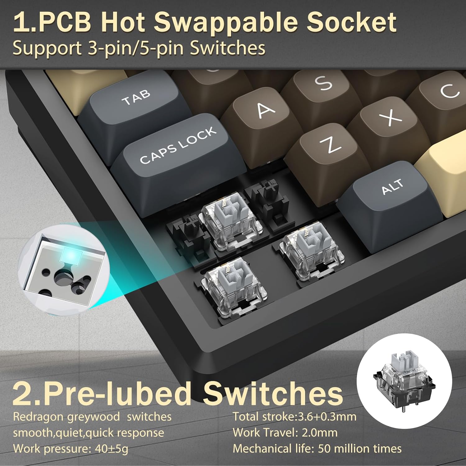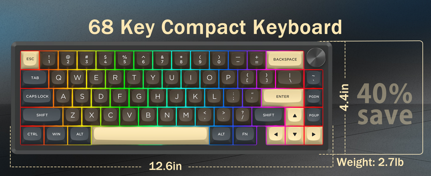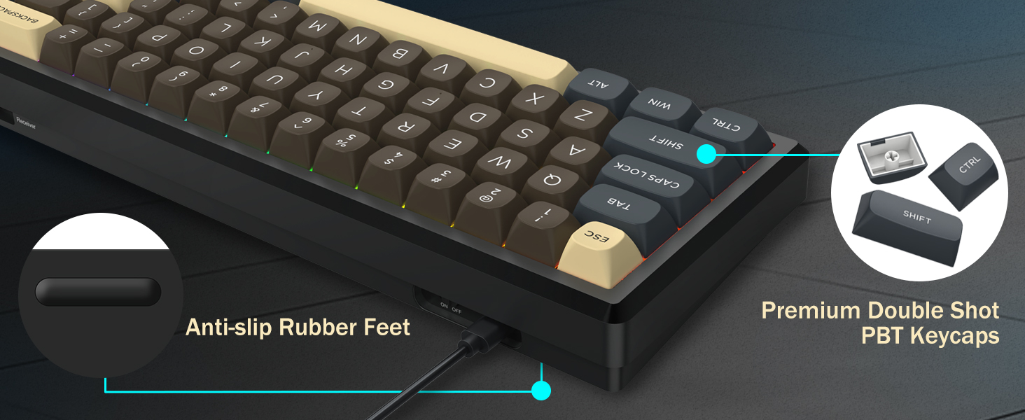 Mat sengem 60% Layout läscht dës Tastatur net wesentlech Schlësselen wärend d'Kärfunktioun duerch Tastekombinatiounen hält. Dësen Design hëlleft Schreifdësch ze reduzéieren a bitt méi Plaz fir Mausbewegung, sou datt et gëeegent ass fir béid Spill- a Produktivitéitsëmfeld.