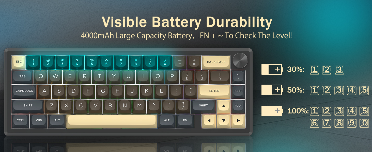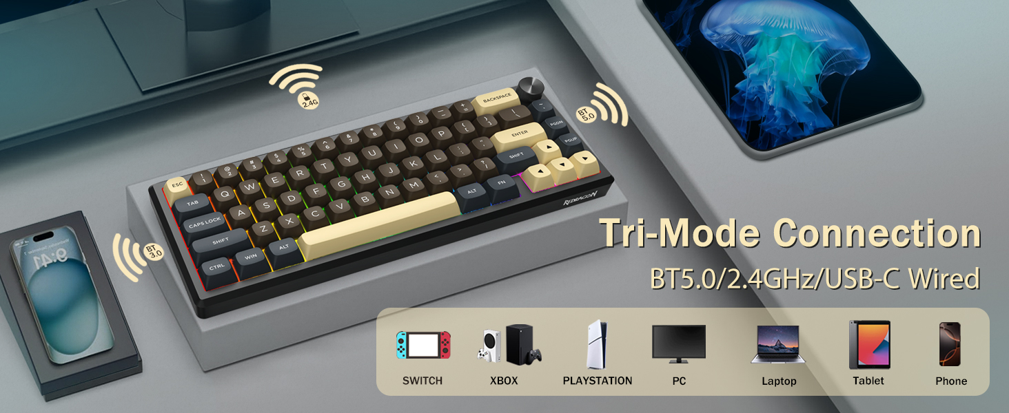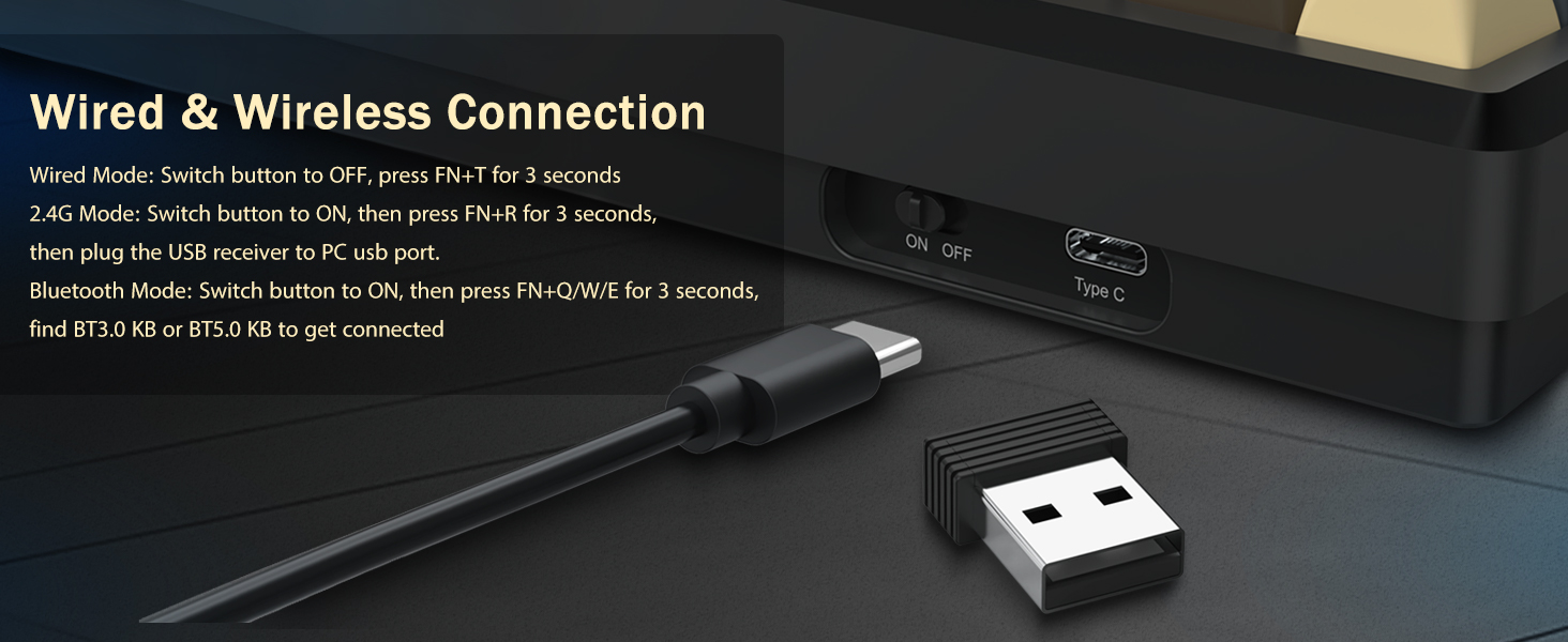 D'Tastatur ënnerstëtzt drahtlose Konnektivitéit fir Komfort an eng kabellos USB Verbindung fir stabil Leeschtung. D'Benotzer kënnen tëscht Modi wiesselen ofhängeg vun hirem Setup.