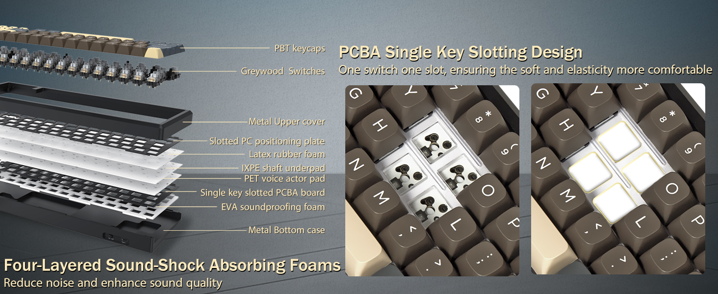 Keycaps si fir Haltbarkeet a konsequent Textur entworf, hëllefen eng komfortabel Tipperfahrung iwwer Zäit ze halen. De Tastaturrahmen bitt Stabilitéit beim Gebrauch, reduzéiert d'Bewegung beim Tippen oder Spillsessiounen.