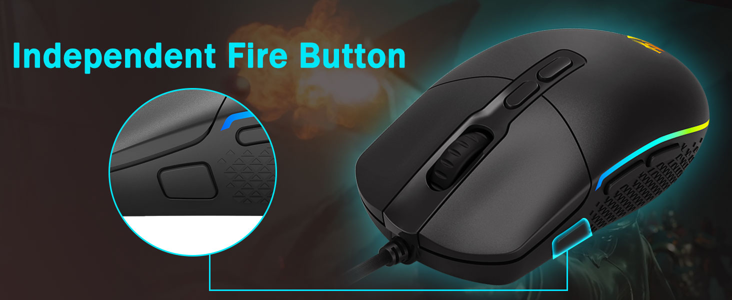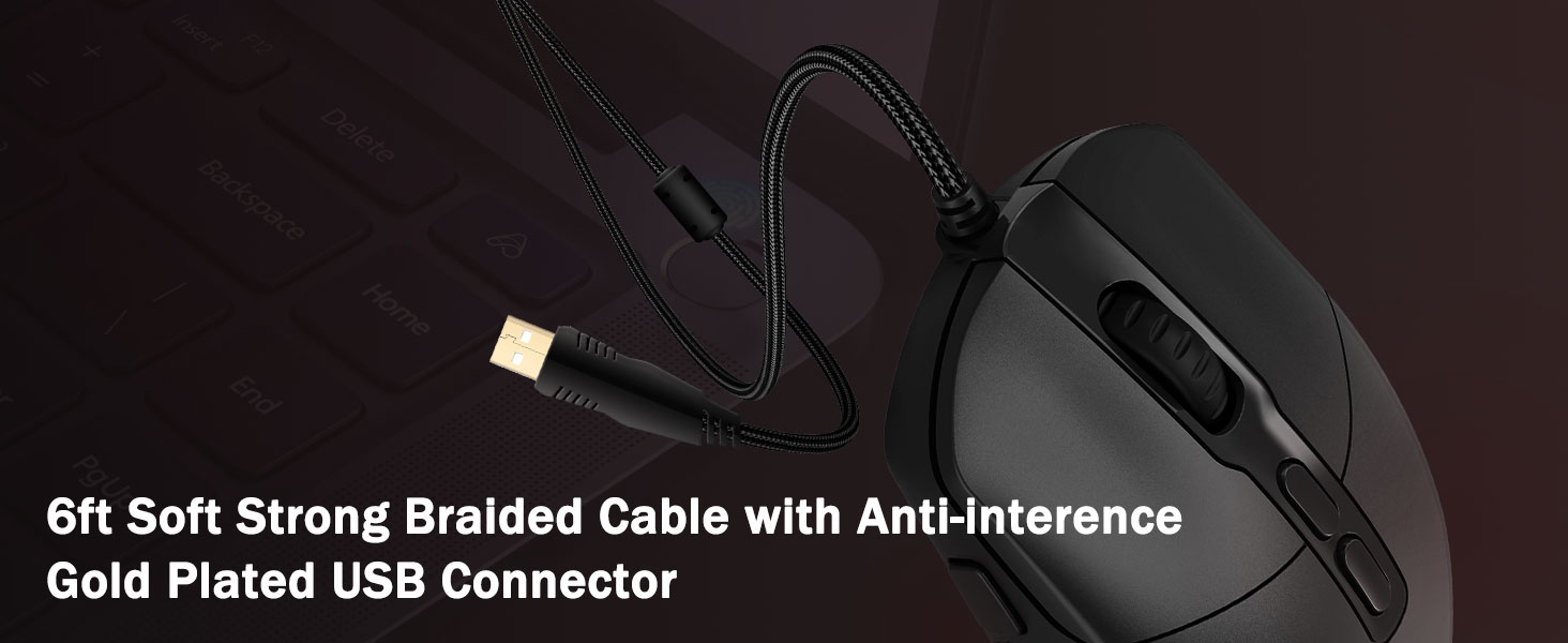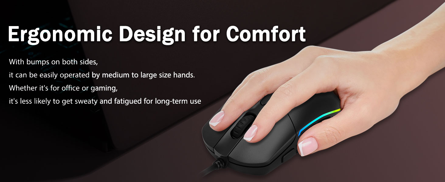 Komfort Grip- Déi ergonomesch Bumps op béide Säiten maachen d'Spillmais an all Hänn passen. Et bitt laang dauerhafte Komfort fir Spiller, ouni Middegkeet och während laange Stonnen intensivem Spillspill. Et rutscht net wann Dir d'Spillmaus ophëlt oder séier a präzis Swipes mécht.