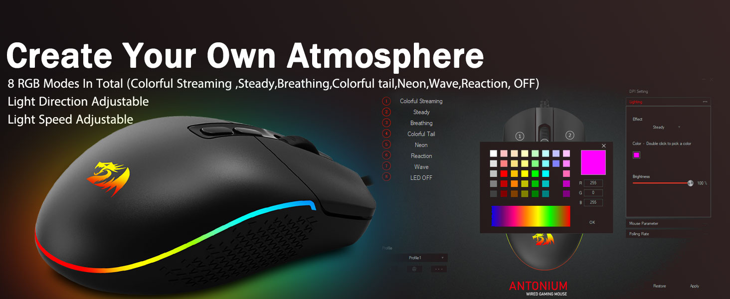 8 Anstänneg RGB Backlit Modi- Maacht d'Backlit un a maacht e puer Kills op Ärem Spillschluechtfeld. Déi hyped dynamesch RGB Backlit Vibe léisst Iech ni erof wann Dir Äre Spillraum dekoréiert, et wier besser mat anere Redragon Accessoiren mat Luuchten un.
