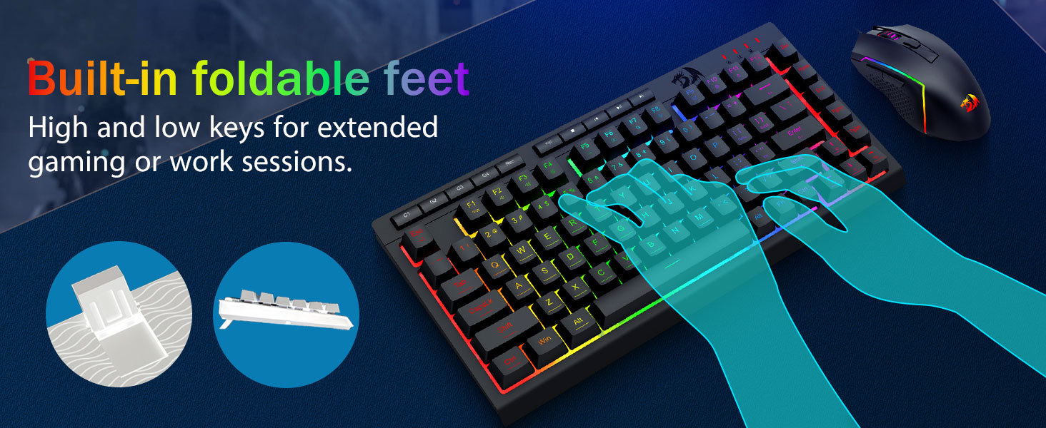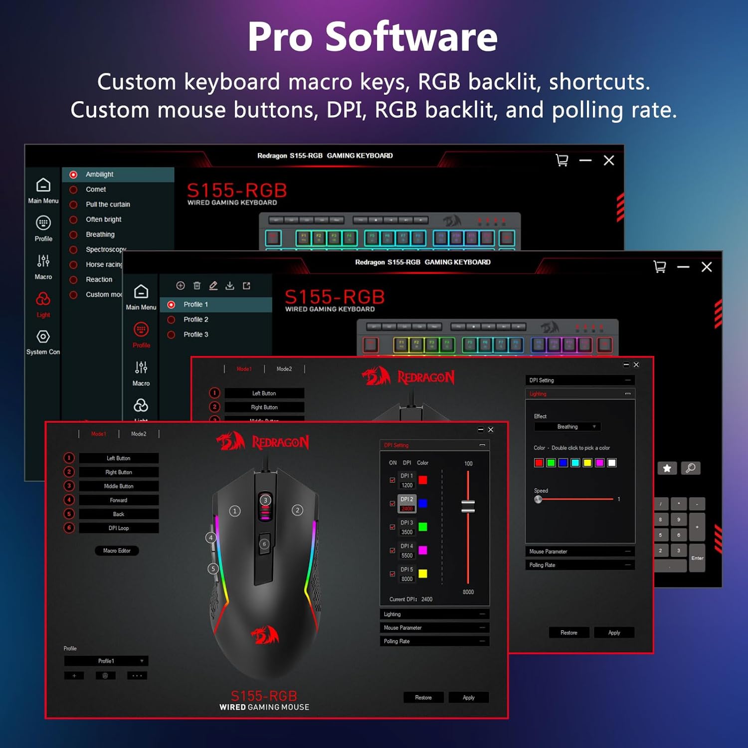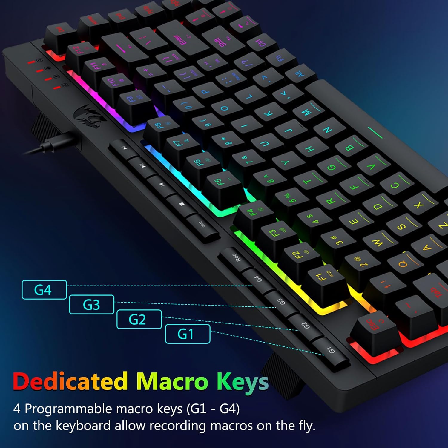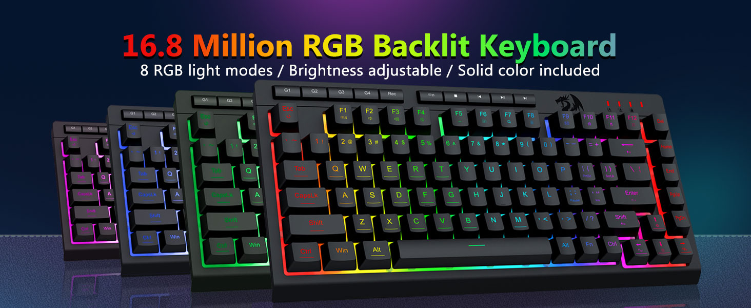 【RGB Gaming Tastatur a Maus】D'Gaming Keyboard huet 8 RGB Beliichtungsmodi fir ze wielen & d'Gaming Maus huet 8 Beliichtungseffekter fir tëscht ze wiesselen, an d'Tastatur kann fir 4 Niveau Geschwindegkeet an Hellegkeet ugepasst ginn fir Är Preferenz ze passen. Egal ob de Set en eenzegt Liicht ass, verännert Liichteffekter oder guer kee Liicht, d'Redragon Gaming Tastatur a Maus entspriechen Äre Besoinen!