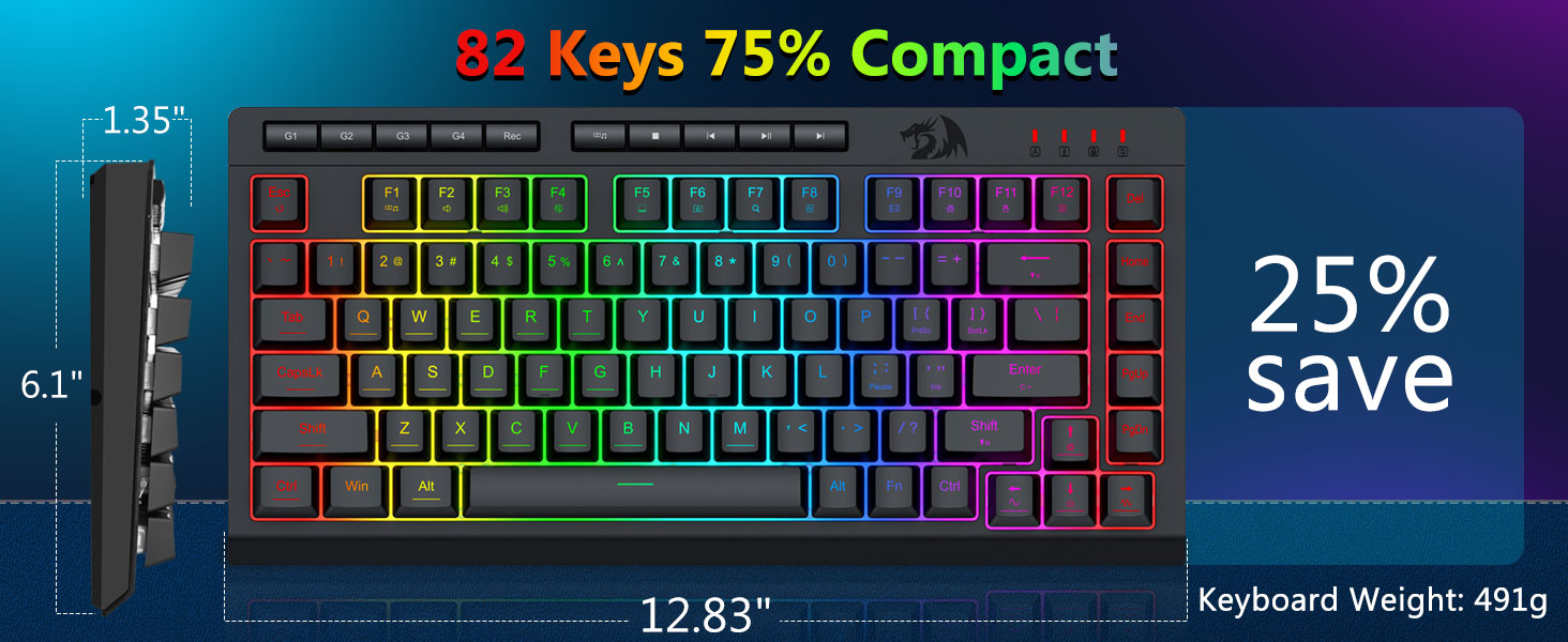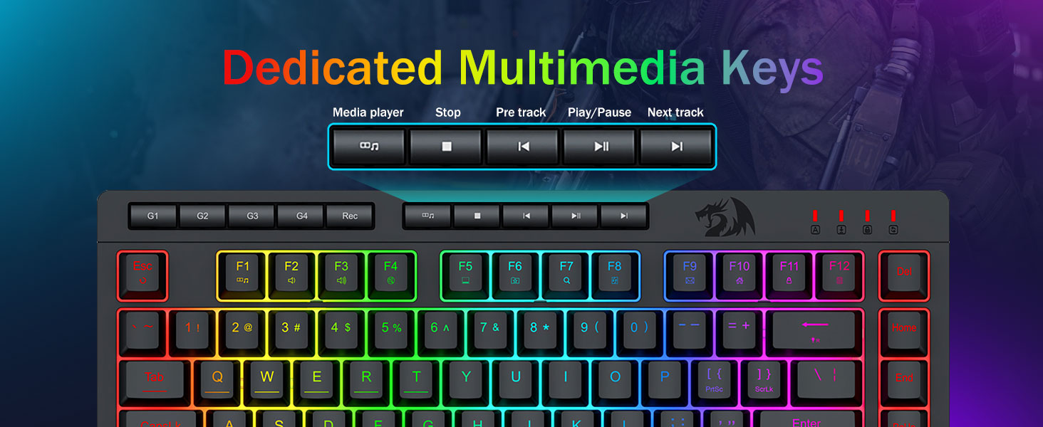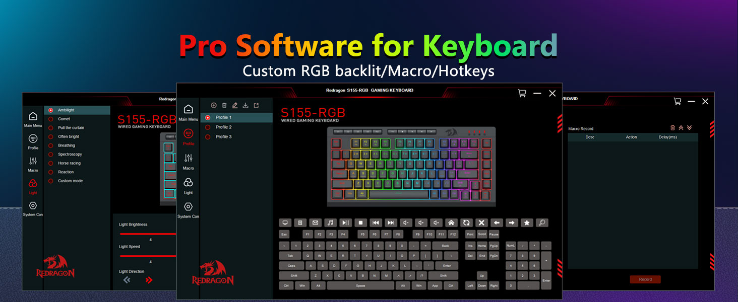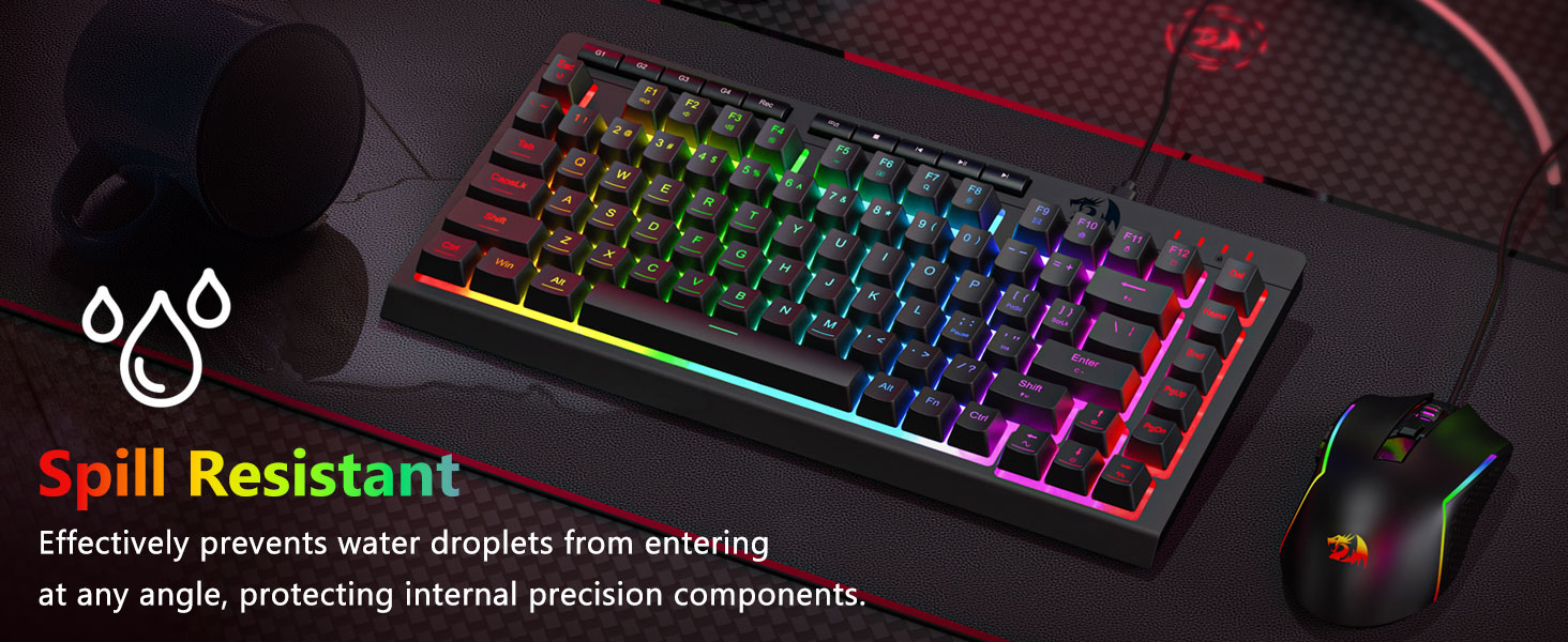 【RGB Gaming Tastatur a Maus】D'Gaming Keyboard huet 8 RGB Beliichtungsmodi fir ze wielen & d'Gaming Maus huet 8 Beliichtungseffekter fir tëscht ze wiesselen, an d'Tastatur kann fir 4 Niveau Geschwindegkeet an Hellegkeet ugepasst ginn fir Är Preferenz ze passen. Egal ob de Set en eenzegt Liicht ass, verännert Liichteffekter oder guer kee Liicht, d'Redragon Gaming Tastatur a Maus entspriechen Äre Besoinen!