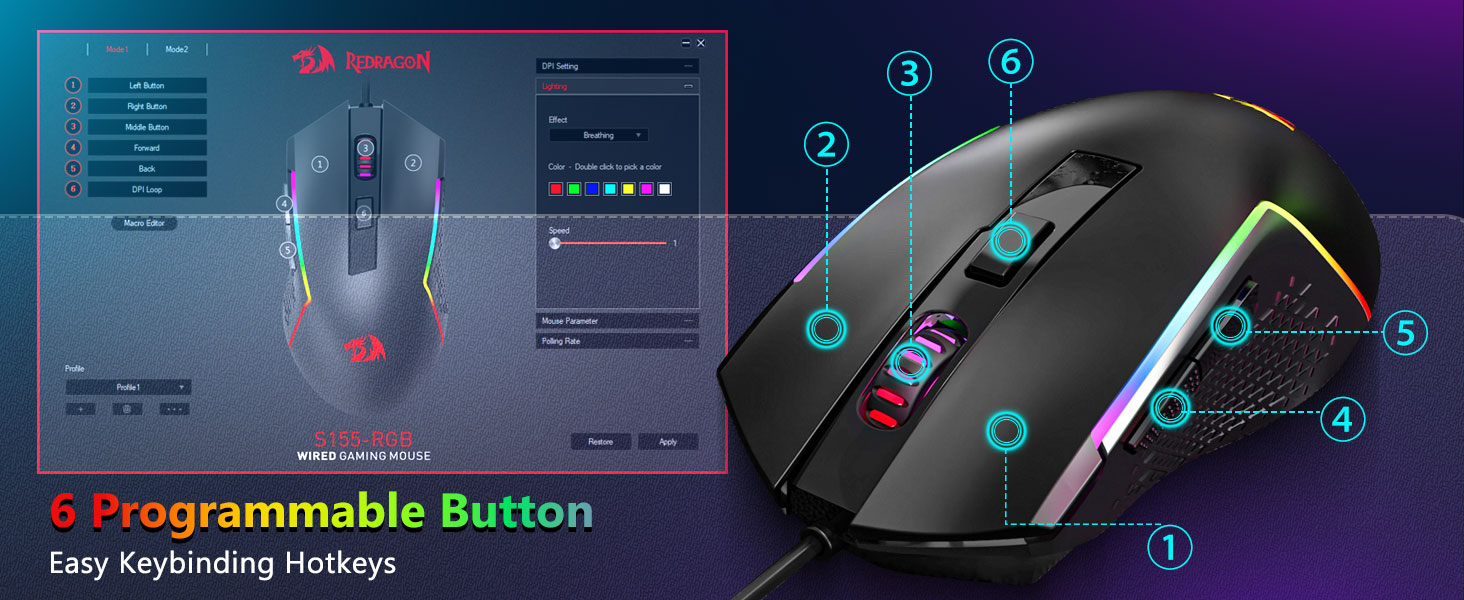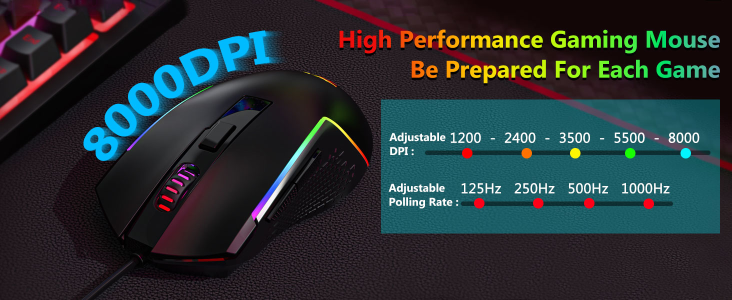 【Professionell Gaming Maus】Dir kënnt den DPI vun 1200 op 8000 iwwer den DPI Knäppchen oder vun 100 op 8000 iwwer de Software Chauffer ajustéieren fir Är verschidde Bedierfnesser am Spill oder Aarbecht einfach ze treffen. Total 7 Knäppercher vun deenen 6 programméierbar sinn. Den High-Precision Sensor liwwert Pinpoint Genauegkeet, während d'Gaming Grade Micro Switches d'Längegkeet, d'Haltbarkeet an d'extrem Reaktiounsfäegkeet garantéieren, wat Iech en nach méi grousse Virdeel iwwer Äre Konkurrenz gëtt. (D'Software ënnerstëtzt och d'Upassung vun der Maus Polling Taux bis 1000Hz)