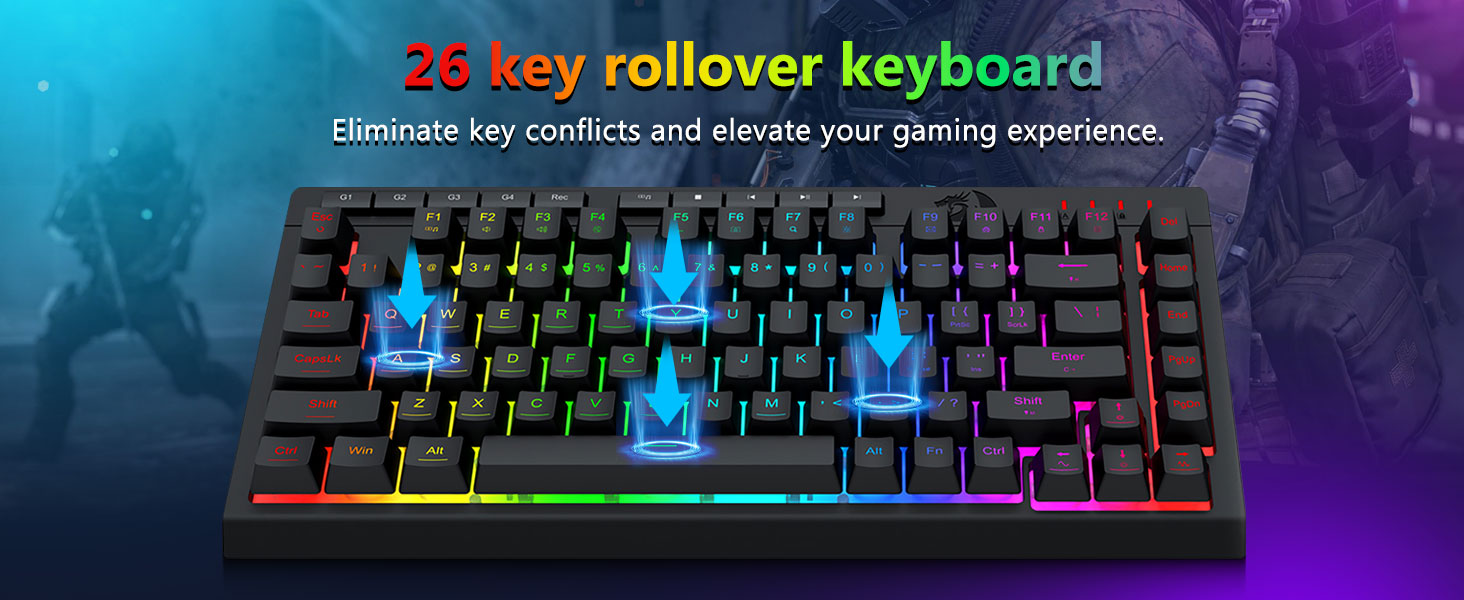 【Komfortabel Spill】Den ausklappbare Stand vun der Tastatur, d'Hautfrëndlech Beschichtung a schwiewend Keycaps erhéijen d'Typkomfort. 26 Keys Anti-Ghosting garantéiert datt all Knäppchen ausgeléist ka ginn. WIN Schlëssel kann fir Spillerinne behënnert ginn. Dës Tastatur a Maus si gewidmet fir eng effizient Spillerfarung ze bidden, wärend maximal Komfort garantéiert