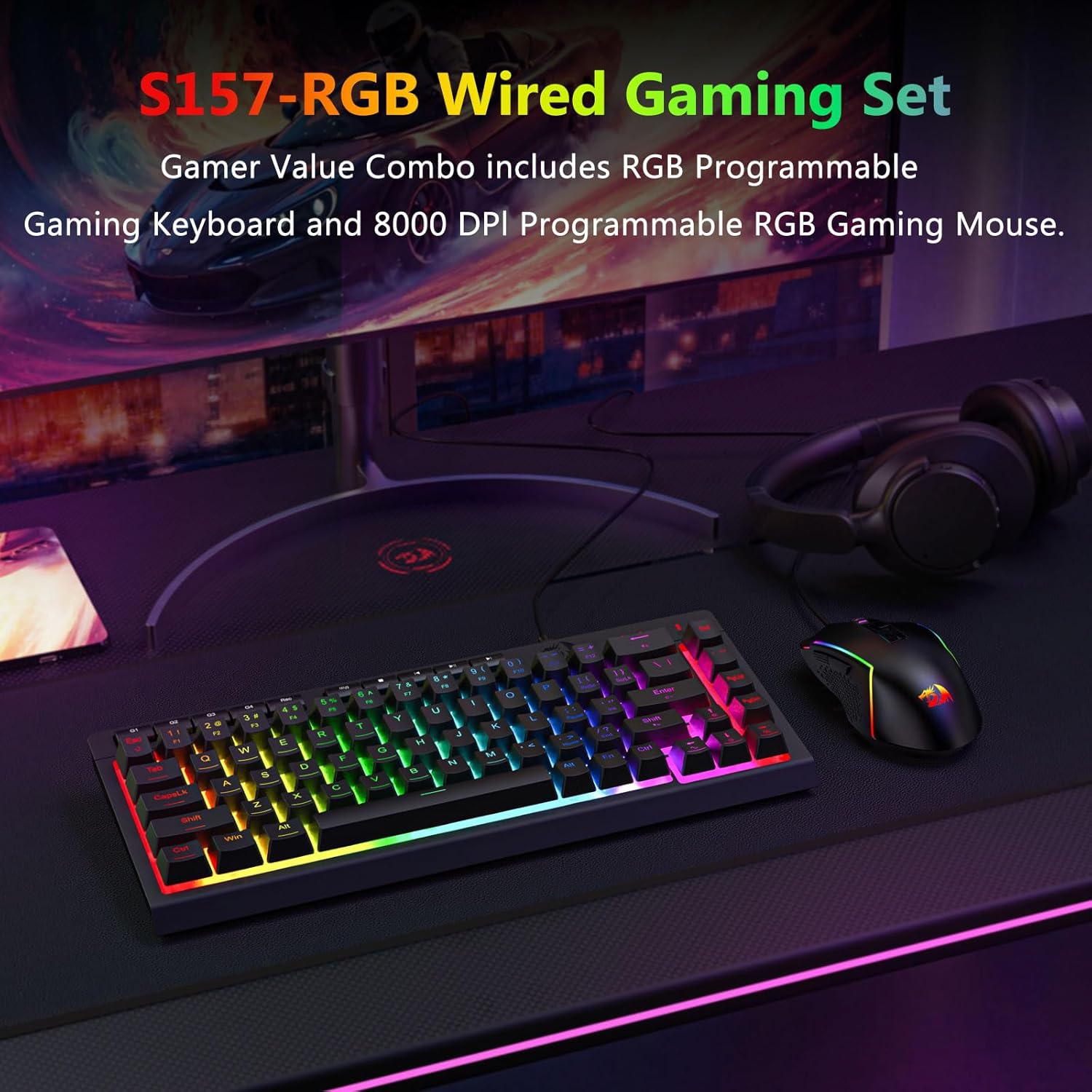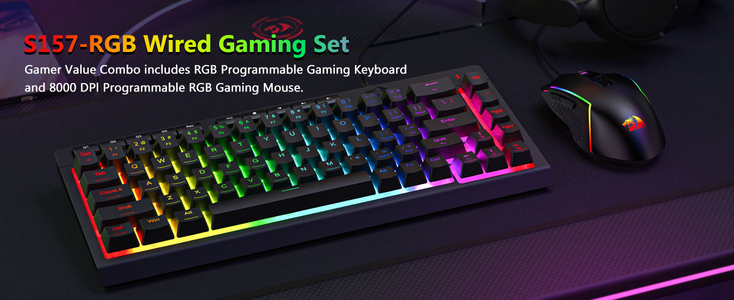 De Black S157 RGB Backlit Wired Gaming Keyboard a Mouse Combo bitt eng praktesch Kombinatioun vu Leeschtung, Haltbarkeet an Usability. Seng voll-Gréisst Tastatur, reaktiounsfäeger Maus, a stabil Kabel Verbindung maachen et gëeegent fir béid Spiller an alldeeglechen Informatik Aufgaben.